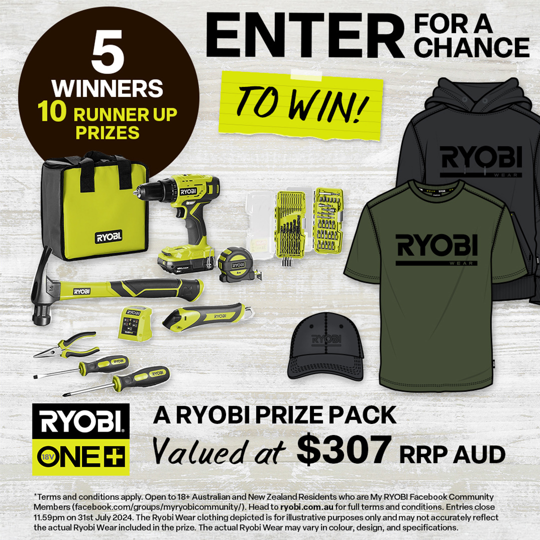 Tell us in 25 words or less why you are RYOBI’s number 1 fan for your chance to win a RYOBI wear pack and a Home Essentials Kit valued at $307 RRP AUD.